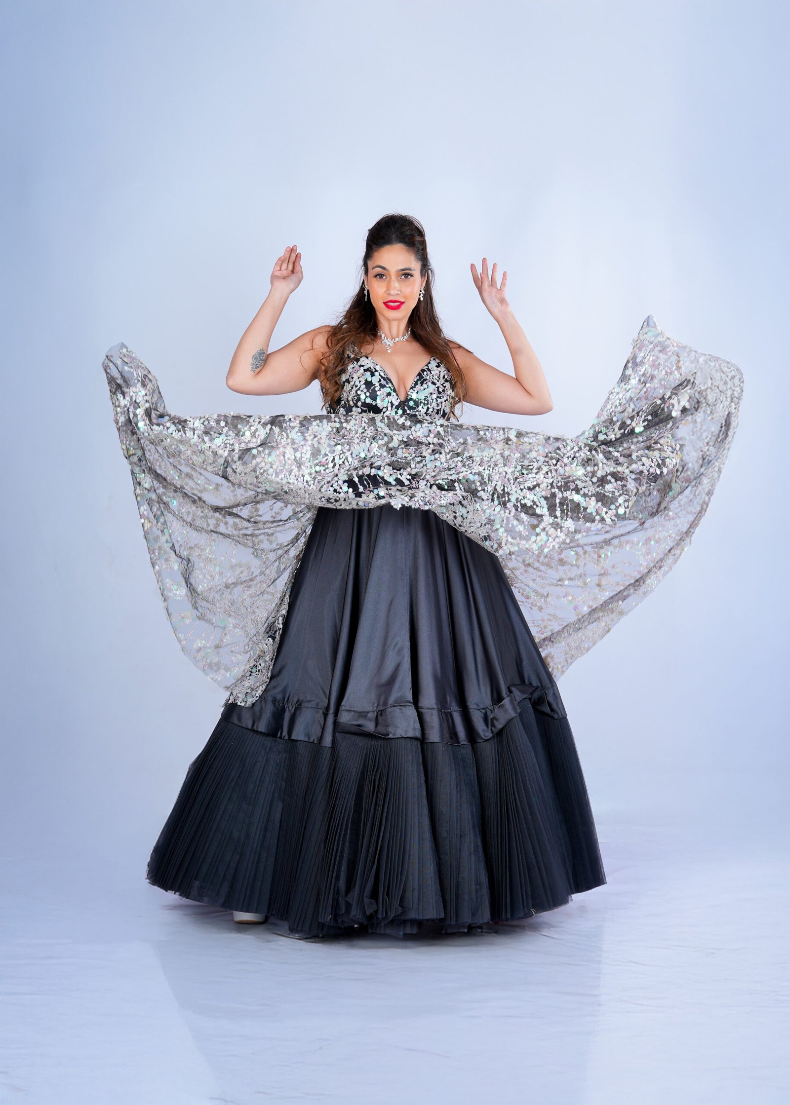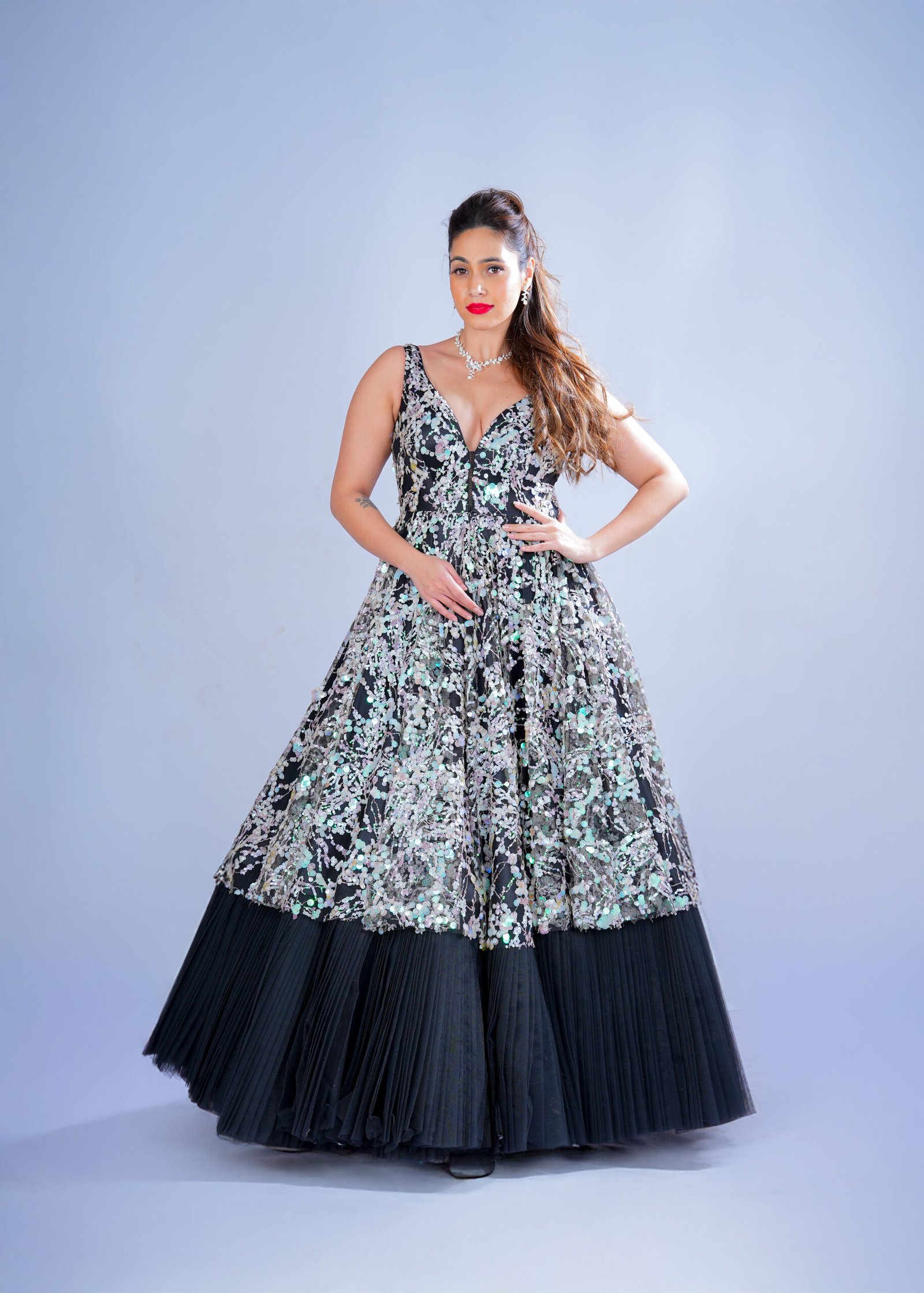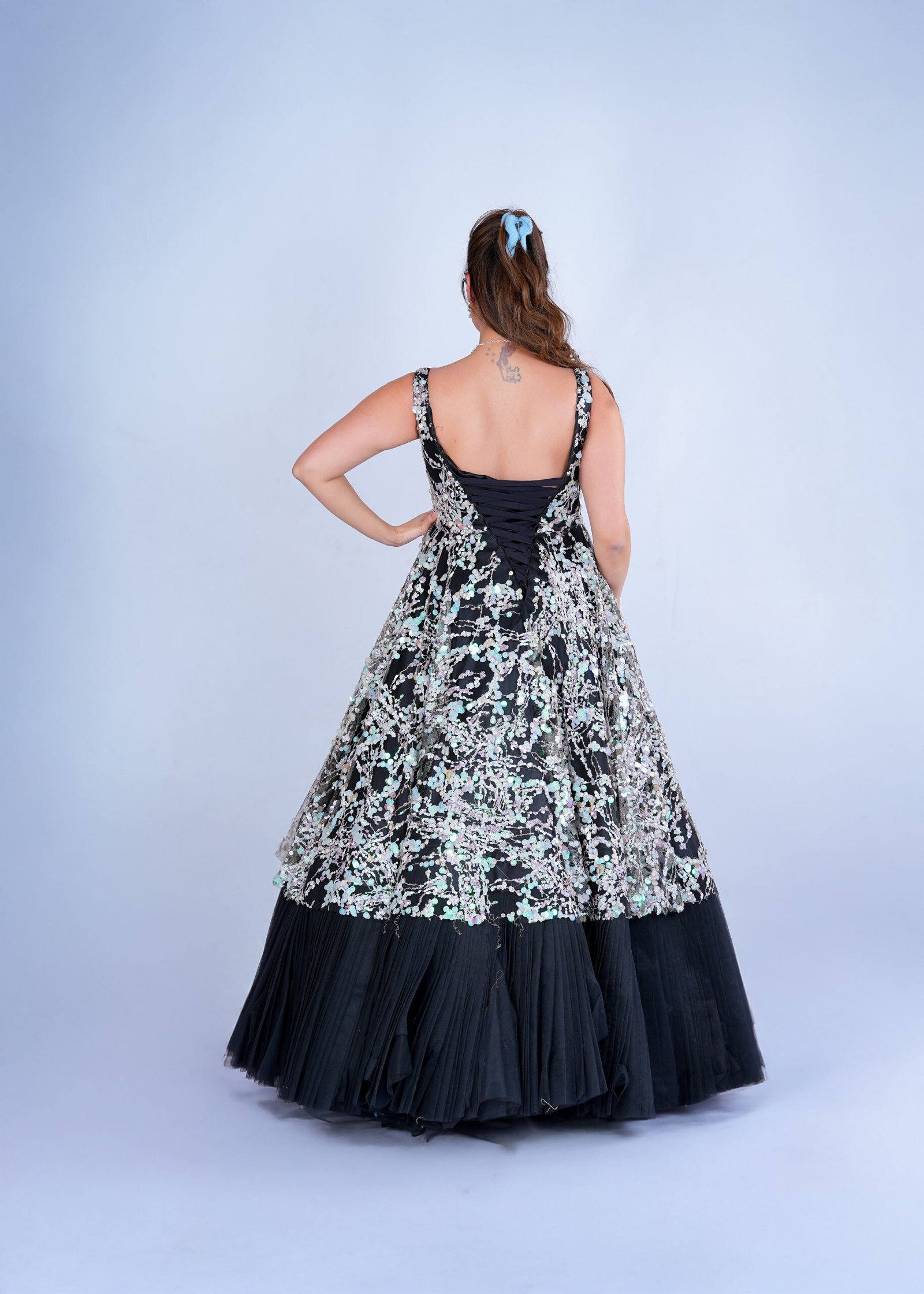 Our black net gown with multi color sequence work in the whole gown which will enhance the look of the gown which shows a unique look in the event. With ready can can skirt in the Gown